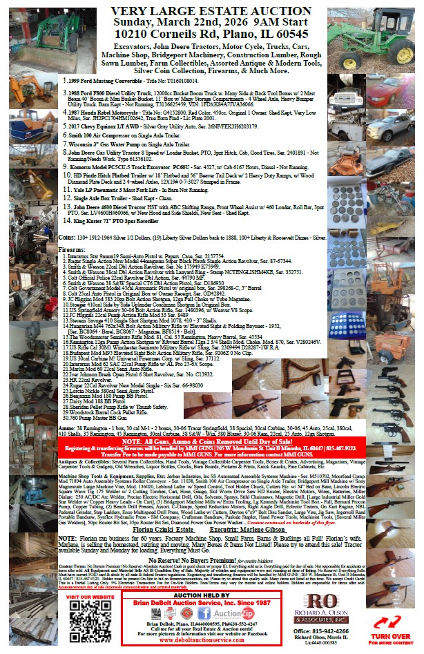 Auction conducted by Brian DeBolt, Plano, IL #440.000595, Ph #630-552-4247.