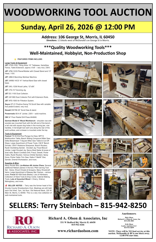 SELLER NOTES – Terry was the former head of the Grundy County Woodworkers Club. Meetings are still held each first Wed, 7pm, 3rd floor, Old National Bank, 220 W Main St, Morris, IL 60450. This is a very nice collection of well-maintained tools.