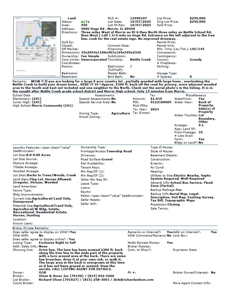 WOW !! If you are looking for a large 9-acre country lot, partially wooded with large trees, overlooking the Nettle Creek to build your dream home, HERE IT IS! Approx. 2300 ft. back off the road for privacy, more adjacent wooded area to the South and East (not included), and one neighbor to the North. Check out the aerial photos in the listing. It is in the sought-after Nettle Creek grade school district and Morris High School. Only 15 minutes from Morris.